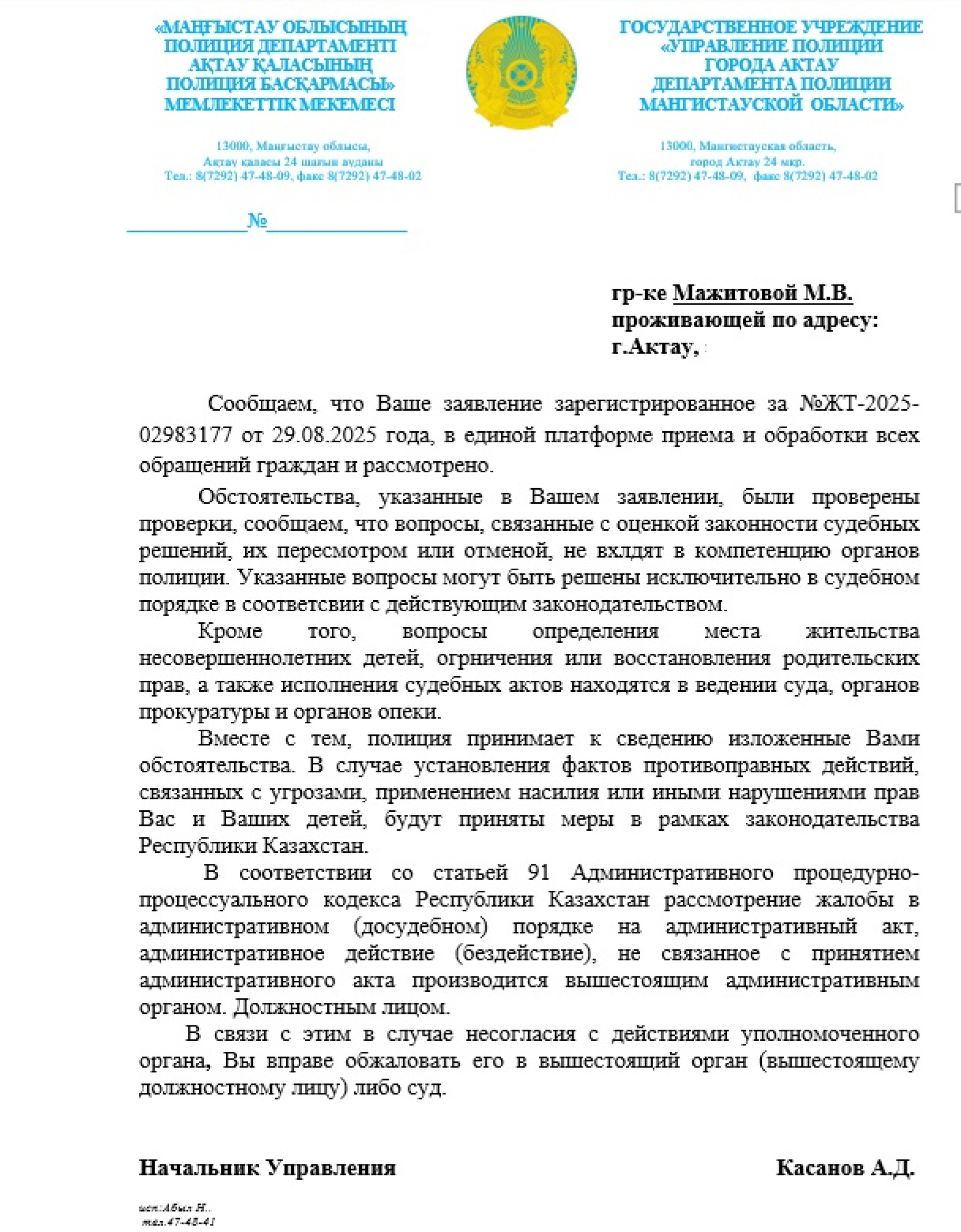 В ответ на обращение в департамент полиции Мангистауской области пришёл ответ - правоохранители не нашли противоправных действий.