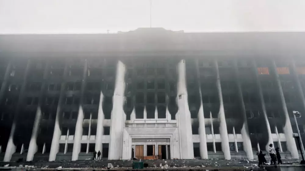 По словам корреспондента, здание городского акимата Алматы 6 января продолжало дымиться и гореть.