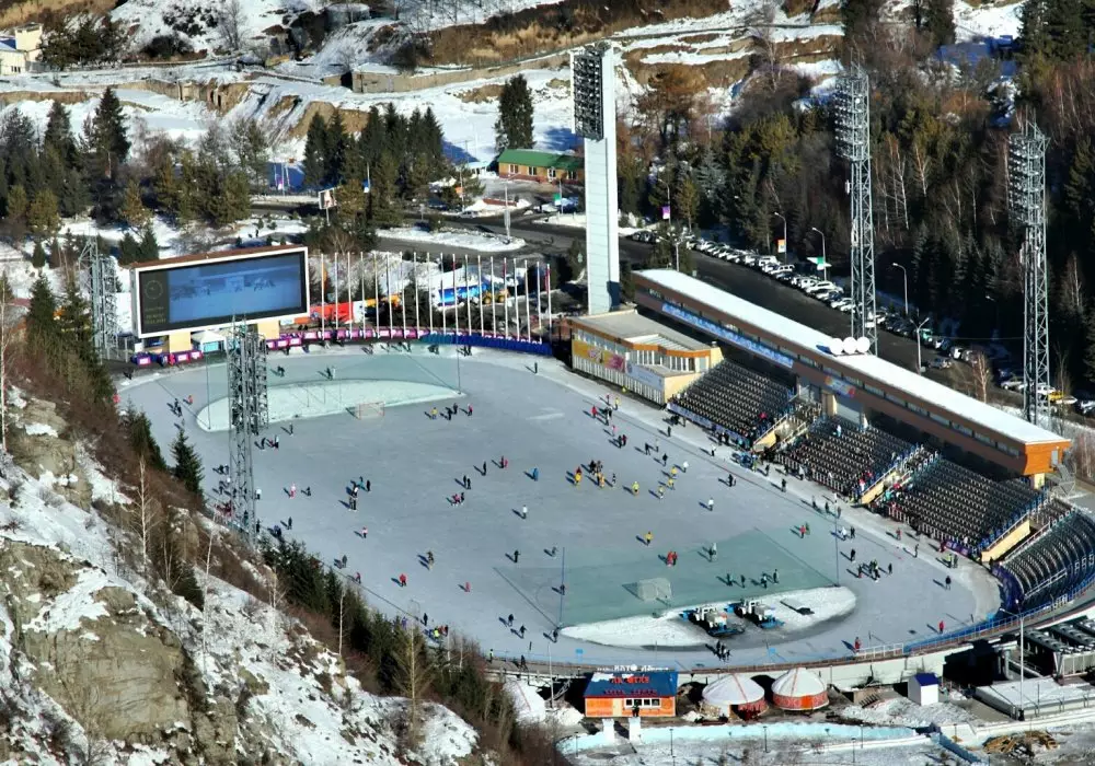 Арена высокогорного катка составляет 10,5 тысячи квадратных метров. Ледовая арена может вместить в себя до трех тысяч человек одновременно. Для этого в пункте проката на балансе числится 2500 пар коньков для посетителей.