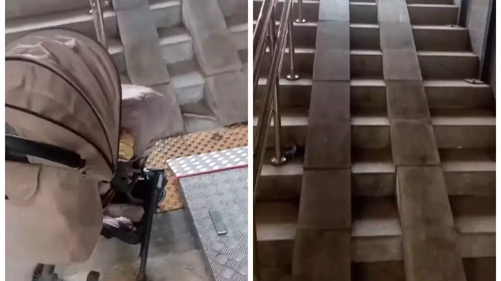 "Как подниматься с коляской? Я еле спустилась и теперь не могу подняться. Подъем резкий. Такое ощущение, что сделали не для людей, а для галочки. Подъемник не работает", - говорит голос за кадром.
