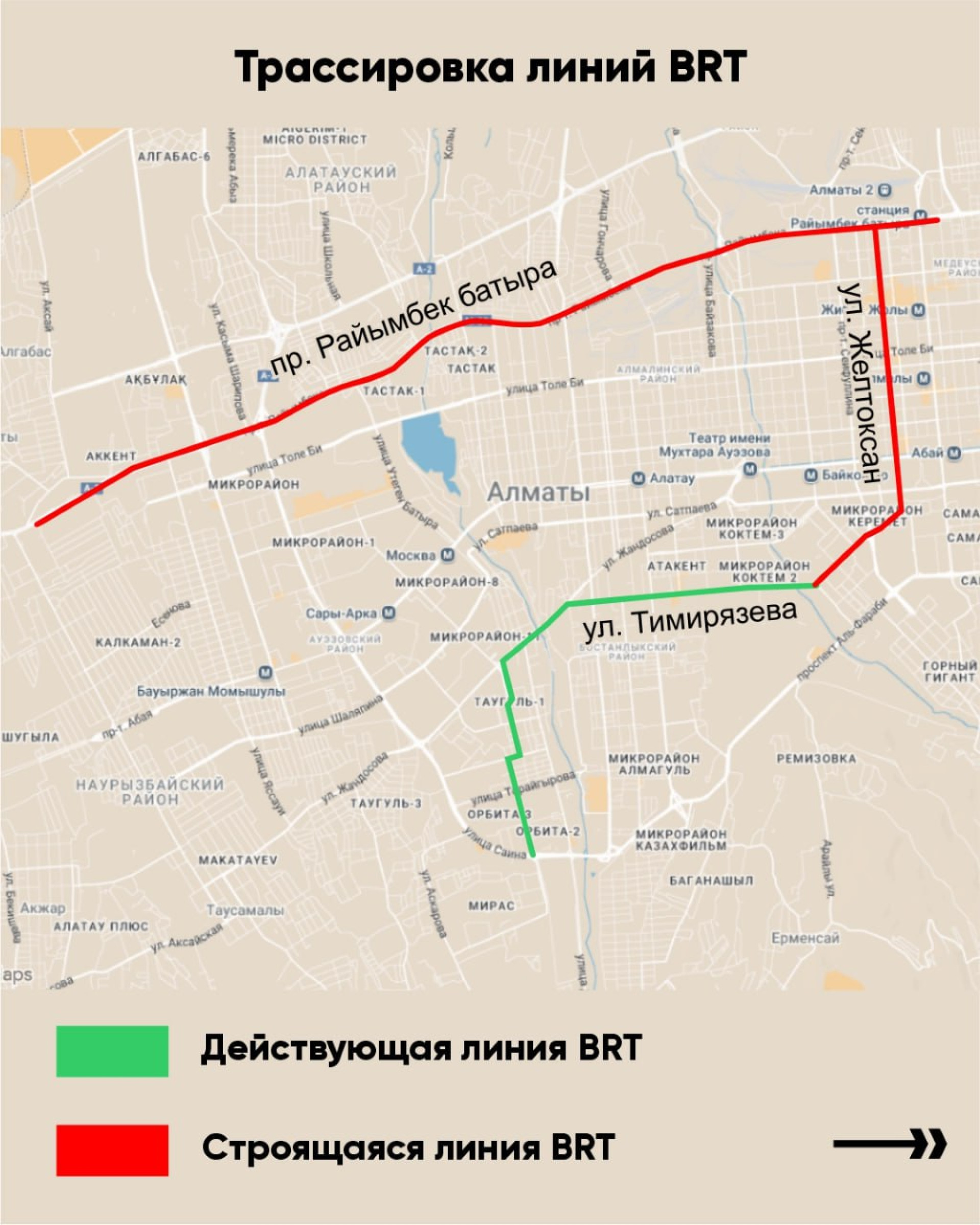 Новые линии — по улице Желтоксан и проспекту Райымбека — планировали соединить с уже существующим BRT на улице Тимирязева. В проект заложили смешанную схему движения: местами полоса проходит по центру дороги, местами — вдоль края проезжей части.