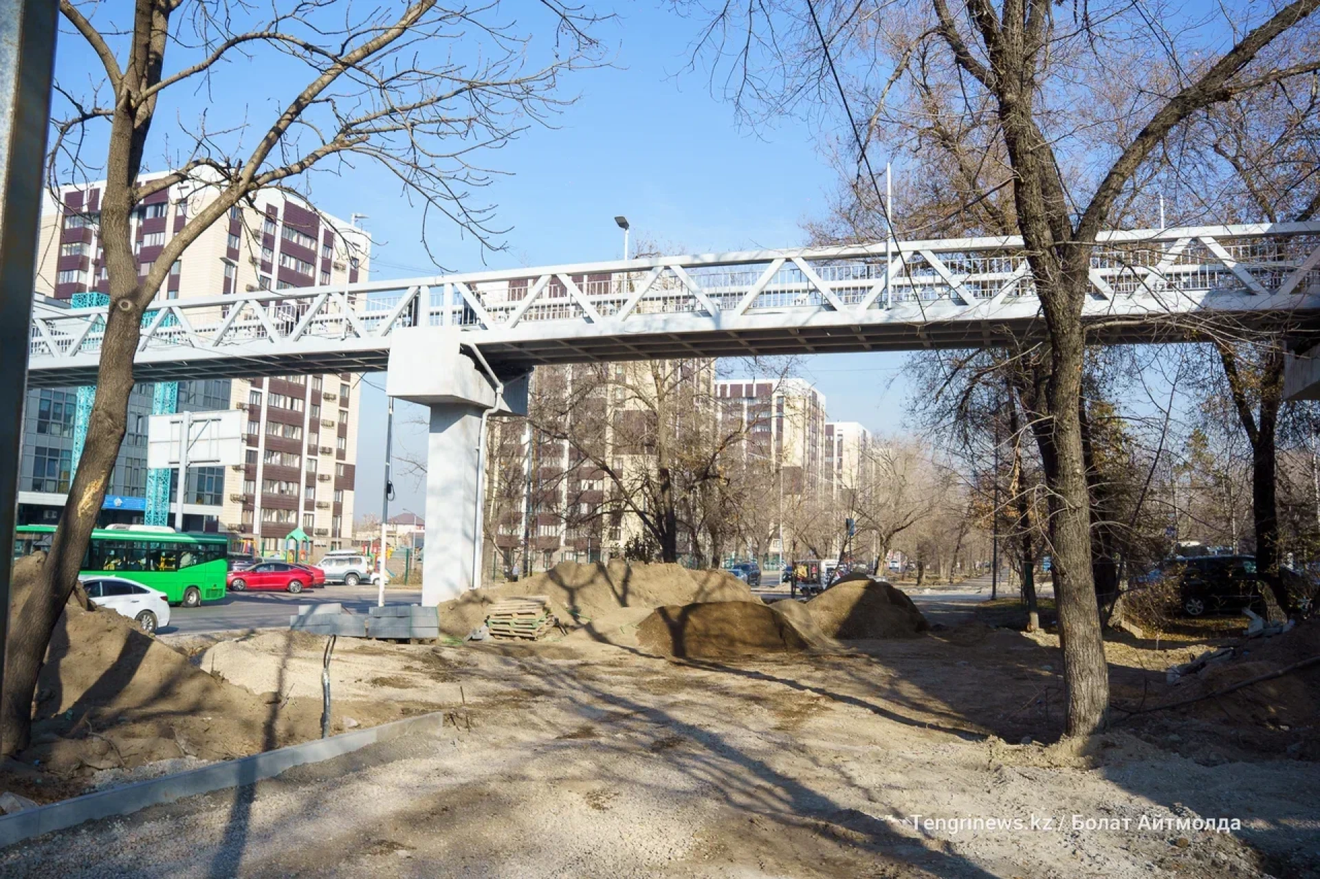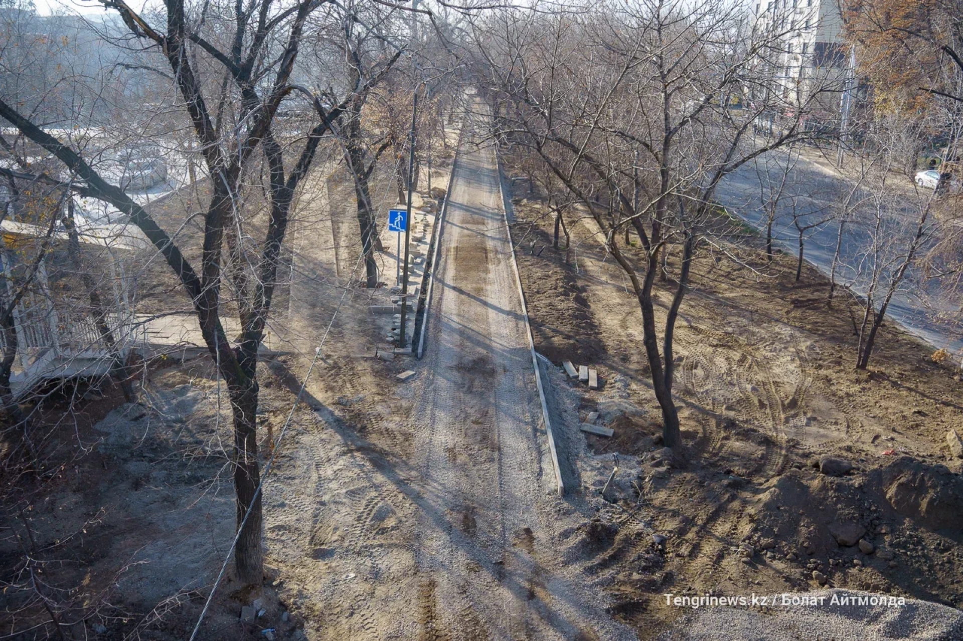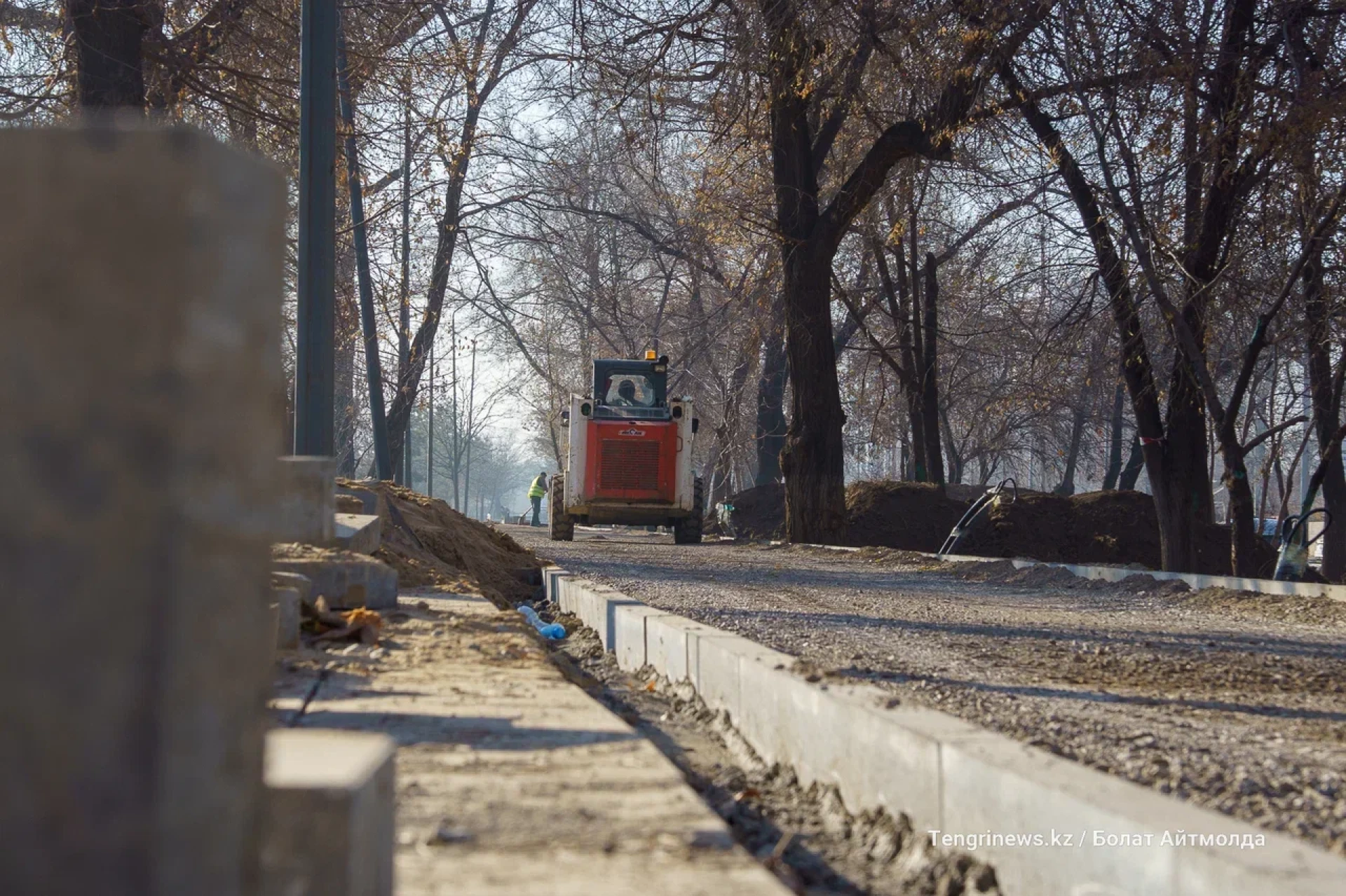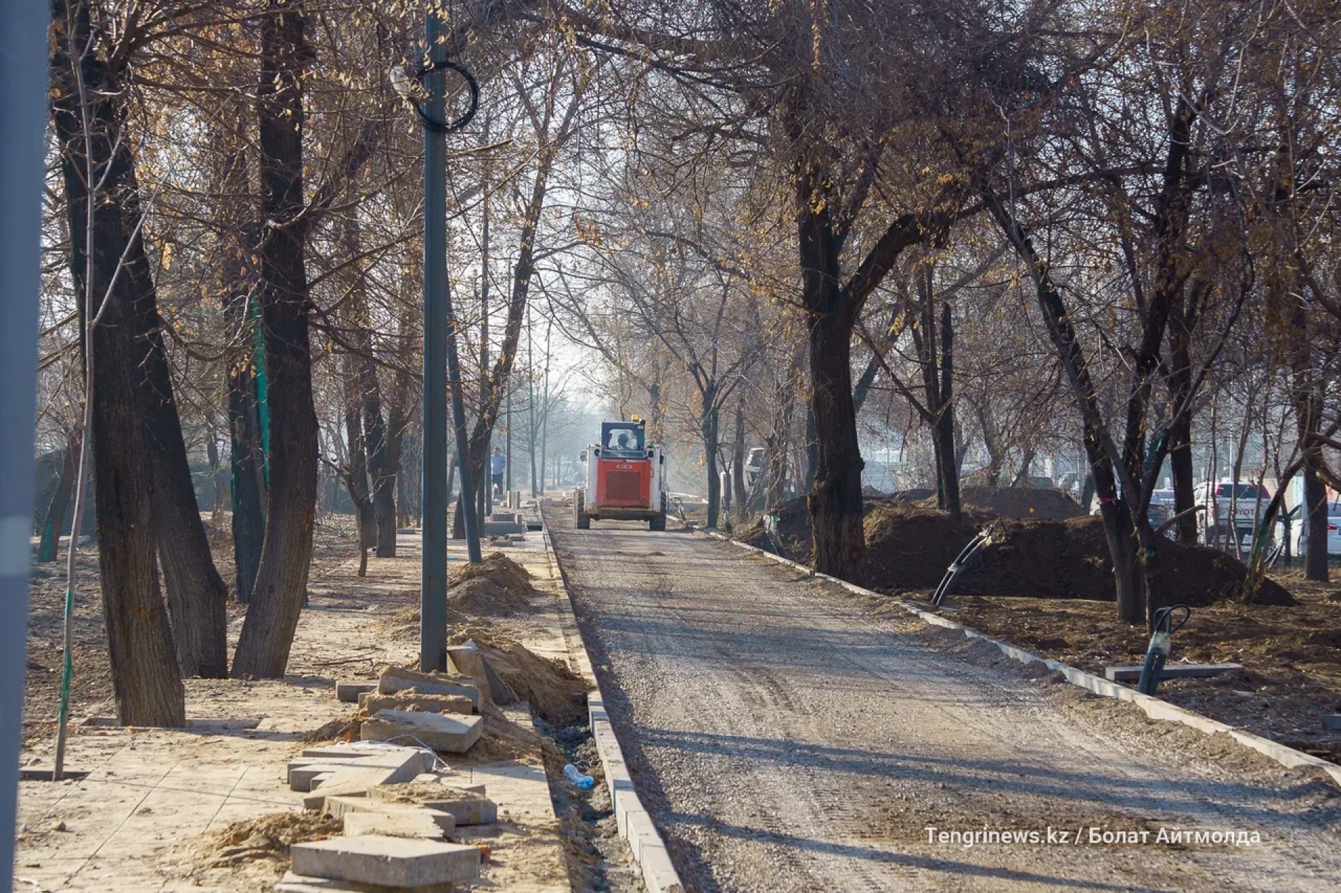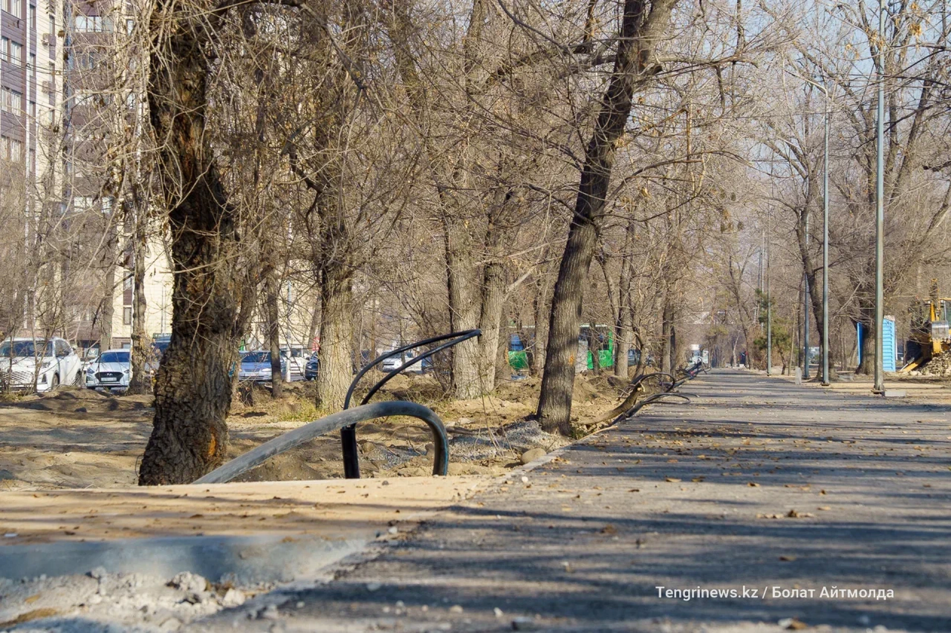 От пересечения Райымбек батыра с улицой Боткина до улицы Тлендиева корреспонденты Tengrinews.kz заметили активное строительство велопешеходной аллеи.