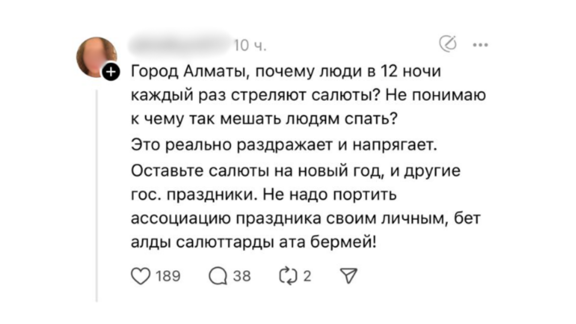 "Город Алматы, почему люди в 12 ночи каждый раз стреляют салюты? Не понимаю, к чему так мешать людям спать? Это реально раздражает и напрягает. Оставьте салюты на Новый год, и другие госпраздники. Не надо портить ассоциацию праздника своим личным!" – написала одна из пользовательниц.