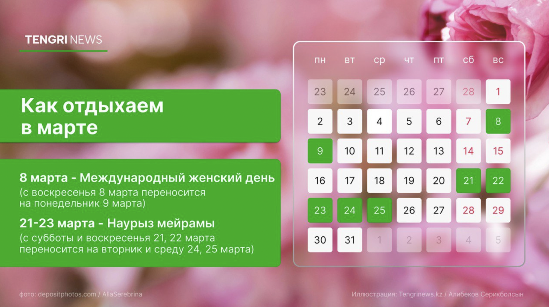 Наурыз мейрамы отмечается с 21 по 23 марта. В 2026 году эти даты приходятся на субботу, воскресенье и понедельник. Из-за совпадения с календарными выходными дополнительные дни отдыха переносятся на 24 и 25 марта.