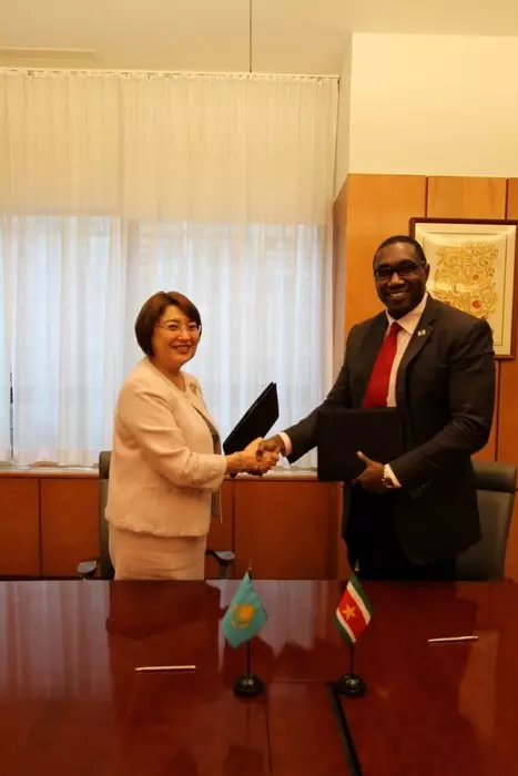"С казахстанской стороны документ подписала постоянный представитель республики при ООН, посол Бирганым Айтимова, со стороны Республики Суринам - постоянный представитель при ООН, посол Хенри Мак Дональд.