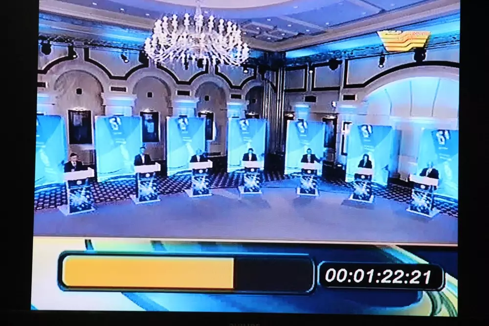 Казахстанцам пообещали миллионы метров жилья, бензин по 40 тенге и нулевой НДС Кадр с теледебатов на телеканале "Хабар".