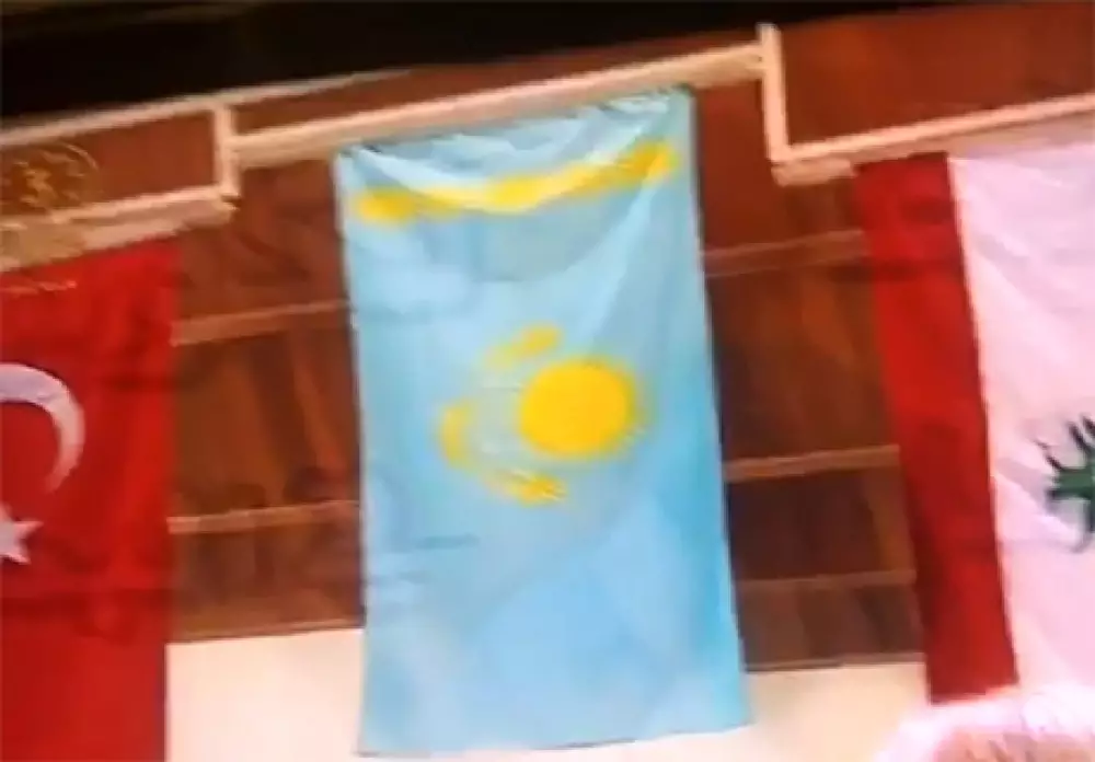Казахстанская сторона выразила ноту протеста в связи с "гимном" Бората На турнире по пулевой стрельбе в Кувейте поднимают флаг Казахстана. Кадр видеоролика с Youtube