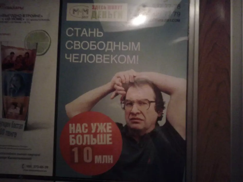 КФН попросил казахстанцев быть осторожнее с "МММ-2011" Рекламный постер в лифте жилого дома Алматы. Фото ©Tengrinews