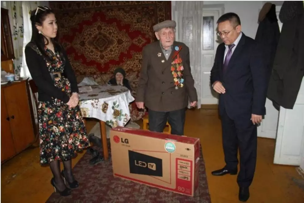 Комитет госдоходов оказал помощь ветеранам ВОВ Представители ДГД по Жамбылской области дарят ветерану подарки. Фото предоставлено пресс-службой Комитета государственных доходов МФ РК.