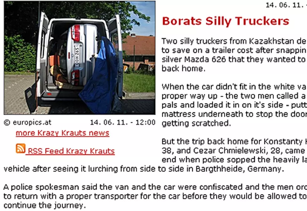 Зарубежные СМИ после инцидента в Германии, когда двое казахстанцев пытались привезти на родину легковой автомобиль "Мазда" в мини-вэне, окрестили их боратами, пишет The Daily Mail.