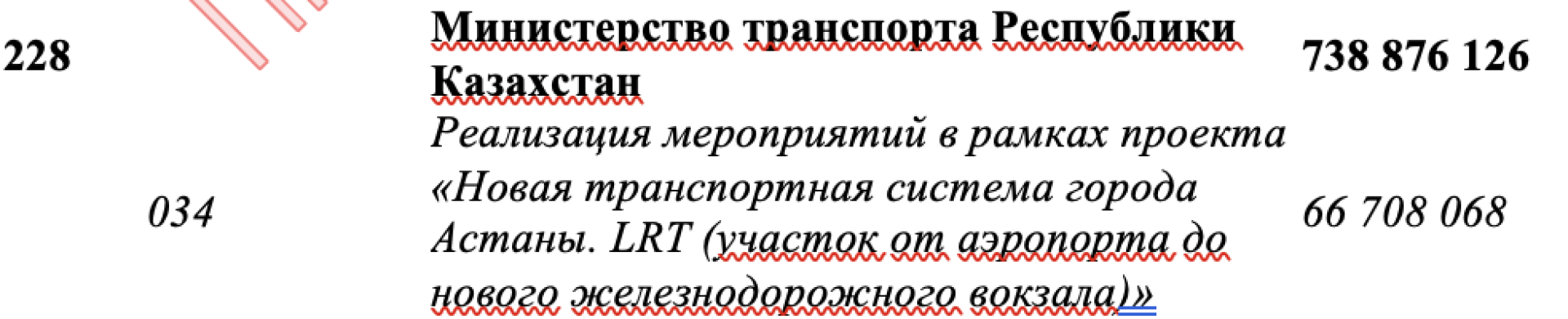 В документе указано, что на проект "Новая транспортная система города Астаны (LRT)" Министерству транспорта выделяют 66 миллиардов тенге. Эти деньги предназначены на участок линии от аэропорта до нового железнодорожного вокзала.