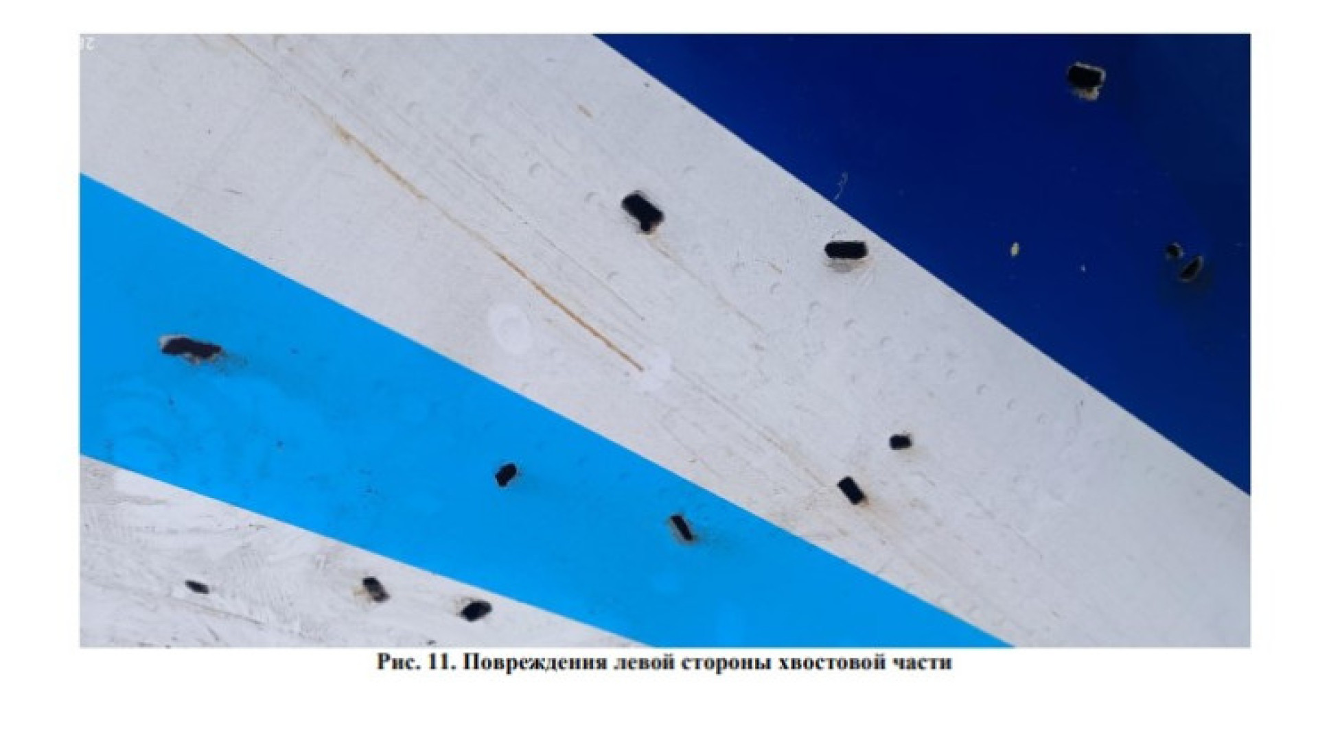 Кроме того, трассологическая экспертиза части трубки гидравлической системы № 2 показала наличие повреждений. Механизм их образования описывается как разрыв металла в результате соприкосновения с твёрдыми предметами. Сквозные повреждения могли быть образованы металлическими фрагментами (внешними объектами), изготовленными из сплава на основе железа.