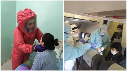 На фотографиях видны защитные костюмы, в которых работают санврачи.