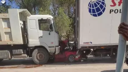 Утром 17 мая возле поселка Кокозек произошла серьезная авария. Очевидцы опубликовали кадры с места происшествия, на которых видно, как красную легковушку зажало между двумя большегрузными авто.