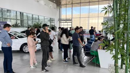 Горожане с самого утра собираются в автосалонах. В салонах на проспекте Туран очереди продолжаются на улице. Многие возмущаются неясными условиями программы.