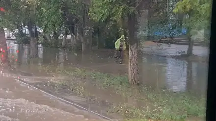 Аллеи и дворы у жилых домов тоже затоплены дождем. Людям приходится идти почти по колено в воде. Кто-то выходит из ситуации, решив пройтись без обуви, а кто-то шагает по воде в кроссовках.