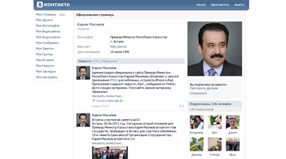 Премьер-министр Казахстана Карим Масимов объявил на своей персональной страничке в Twitter об открытии своей официальной страницы в социальной сети "ВКонтакте", передает корреспондент Tengrinews.kz.