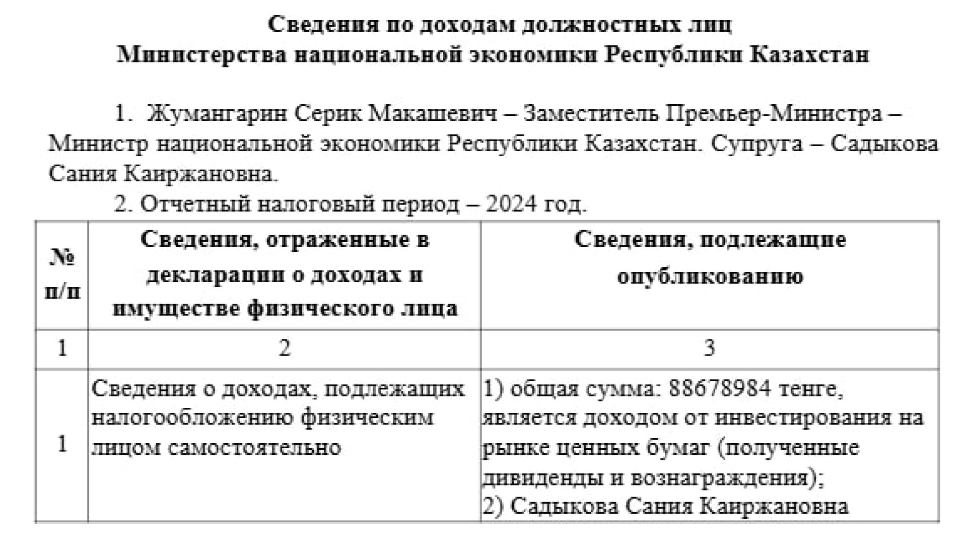 Сведения опубликованы на сайте министерства. В отчёте указана супруга министра Сания Садыкова и сумма в 88 678 984 тенге.