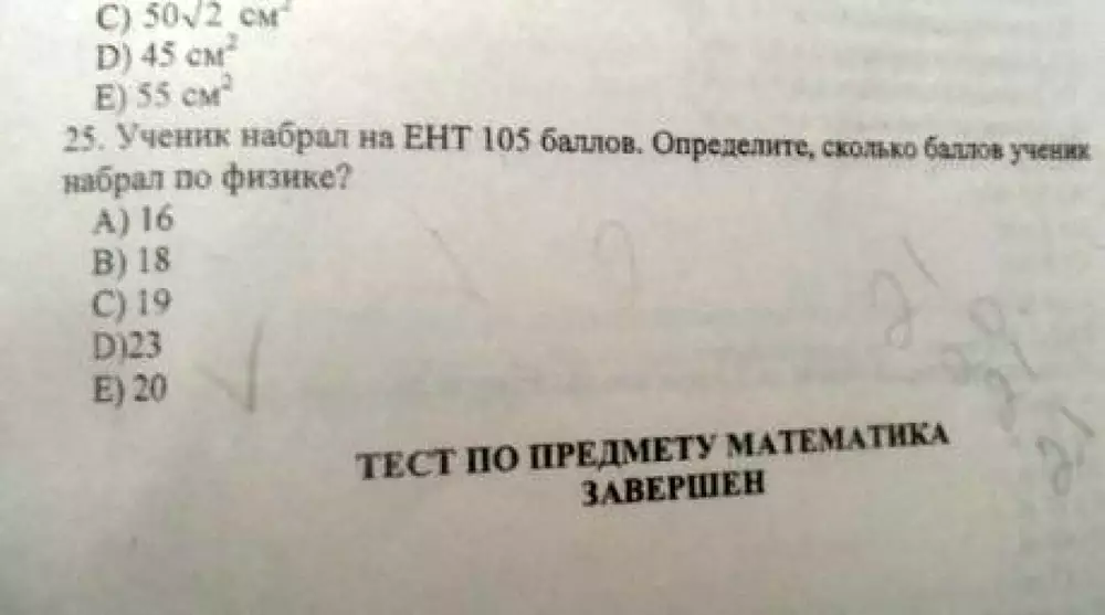 Напомним, выпускники в одной из социальных сетей выкладывают фотографии с некорректными вопросами, которые они встречают в пробниках ЕНТ-2013. Вопрос, который ставит в тупик многих учеников 11 классов, сформулирован так: "Ученик набрал 105 баллов на ЕНТ. Определите, сколько он набрал по физике?" Жалуются школьники и на то, что к задачам по математике не всегда можно найти график.