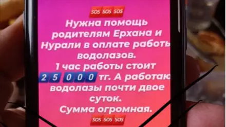 Пользователи социальных сетей и мессенджеров распространяют информацию о сборе средств. Согласно рассылке, за 1 час работы водолазов необходимо заплатить 25 тысяч тенге. Мошенники утверждают, что родители пропавших школьников должны заплатить огромную сумму.