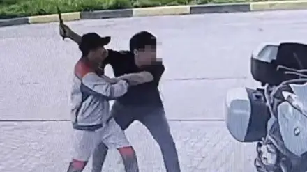 На кадрах видно, как мотоциклист идет к бензоколонке, за ним идет некий мужчина. В какой-то момент мужчина вытаскивает из кармана нечто похожее на нож и наносит несколько ударов мотоциклисту.
