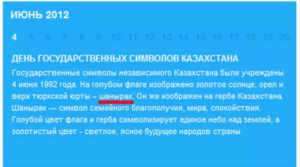 "На голубом флаге изображено золотое солнце, орел и верх тюркской юрты - шанырак. Он же изображен на гербе Казахстана. Шанырак - символ семейного благополучия, мира, спокойствия. Голубой цвет флага и герба символизирует единое небо над землей, а золотистый цвет - светлое, ясное будущее народов", - говорится в сообщении на сайте телеканала. Однако, как известно, изображения шанырака на флаге Казахстана нет.