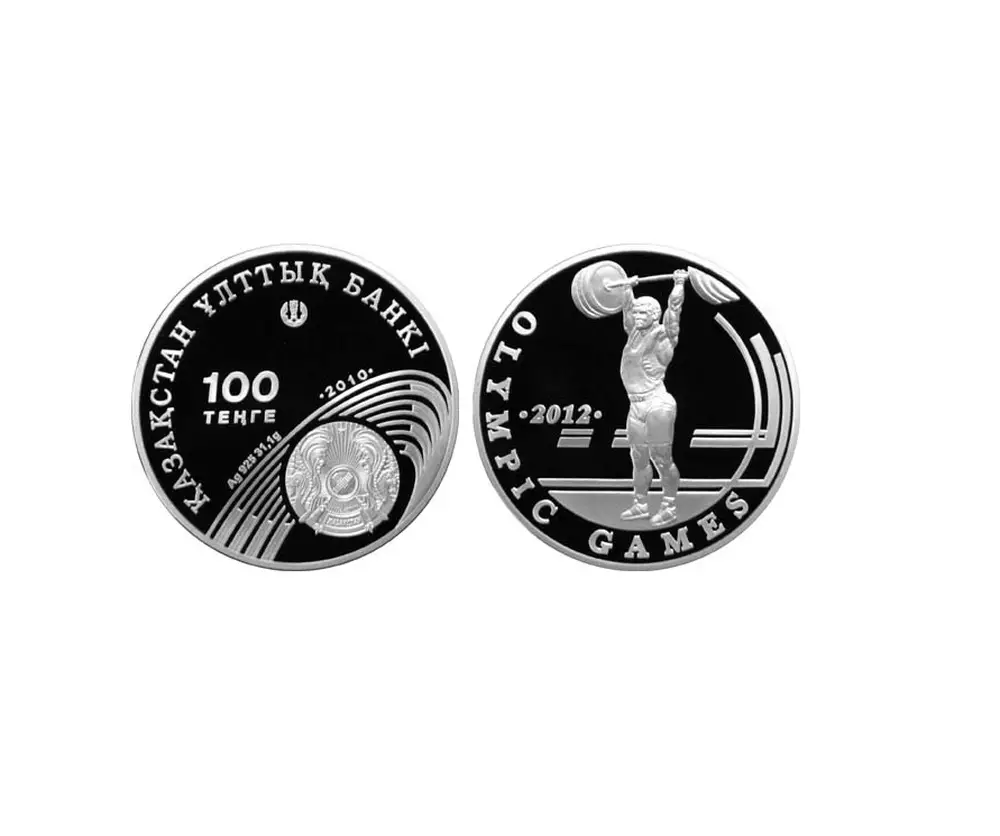 По информации Нацбанка, монета изготовлена из серебра 925-й пробы, массой 31,1 грамма, диаметром 38,61 миллиметра, тираж монеты составляет 12 тысяч штук (3 тысячи штук - для внутреннего рынка Казахстана). На аверсе монеты в нижней части изображен герб Казахстана в обрамлении стен стадиона, на реверсе - изображение штангиста. В левой части цифра "2012", обозначающая год проведения Олимпийских игр. По окружности - надпись "OLYMPIC GAMES" на английском языке. Боковая поверхность (гурт) рифленая.