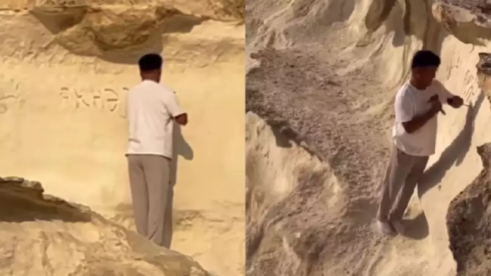 История с вандалом, который при помощи молотка и отвертки выбивал, предположительно, свое имя на стене древнего каньона Ыбыкты-Сай в Мангистауской области, получила неожиданное продолжение. Пользователи сети опознали в нем чиновника из Актобе, работающего в сфере культуры, передает корреспондент Tengrinews.kz.