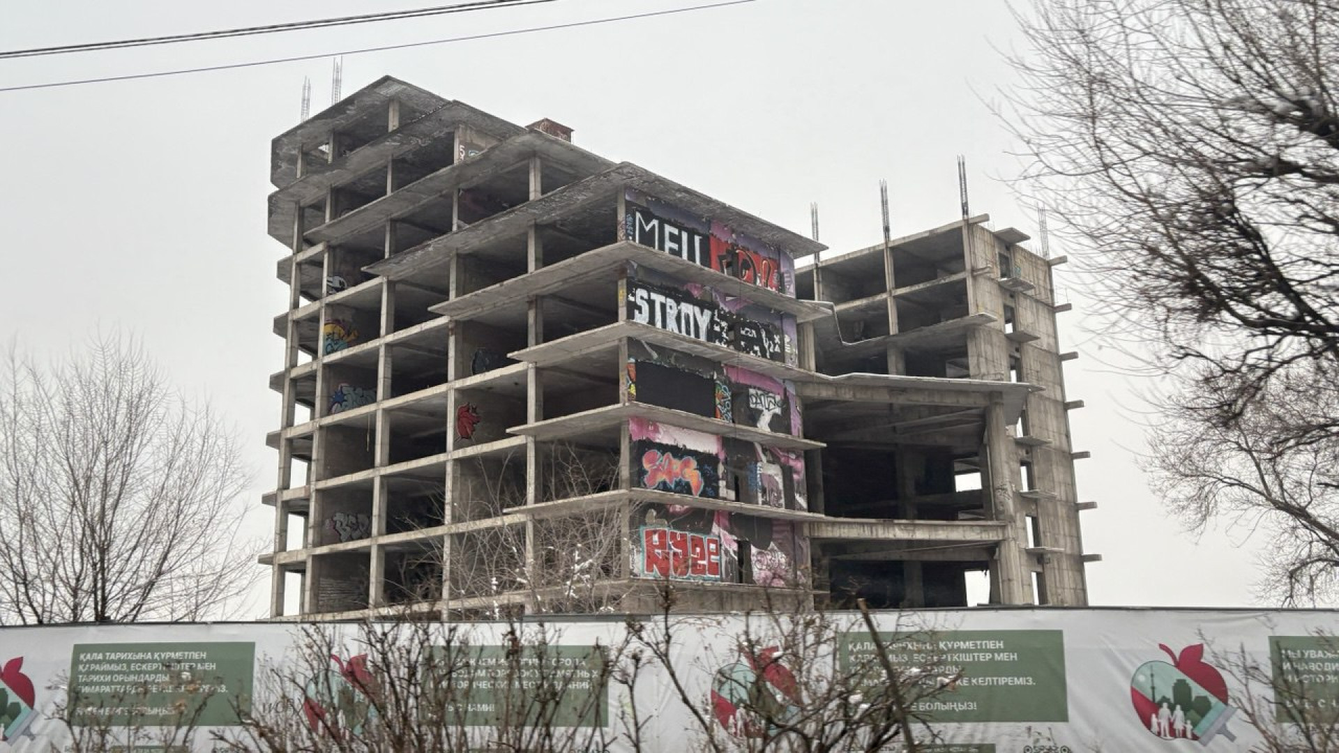 Надпись Mellstroy: в Алматы сносят долгострой Фото © Tengrinews.kz / 21 декабря 2025 год