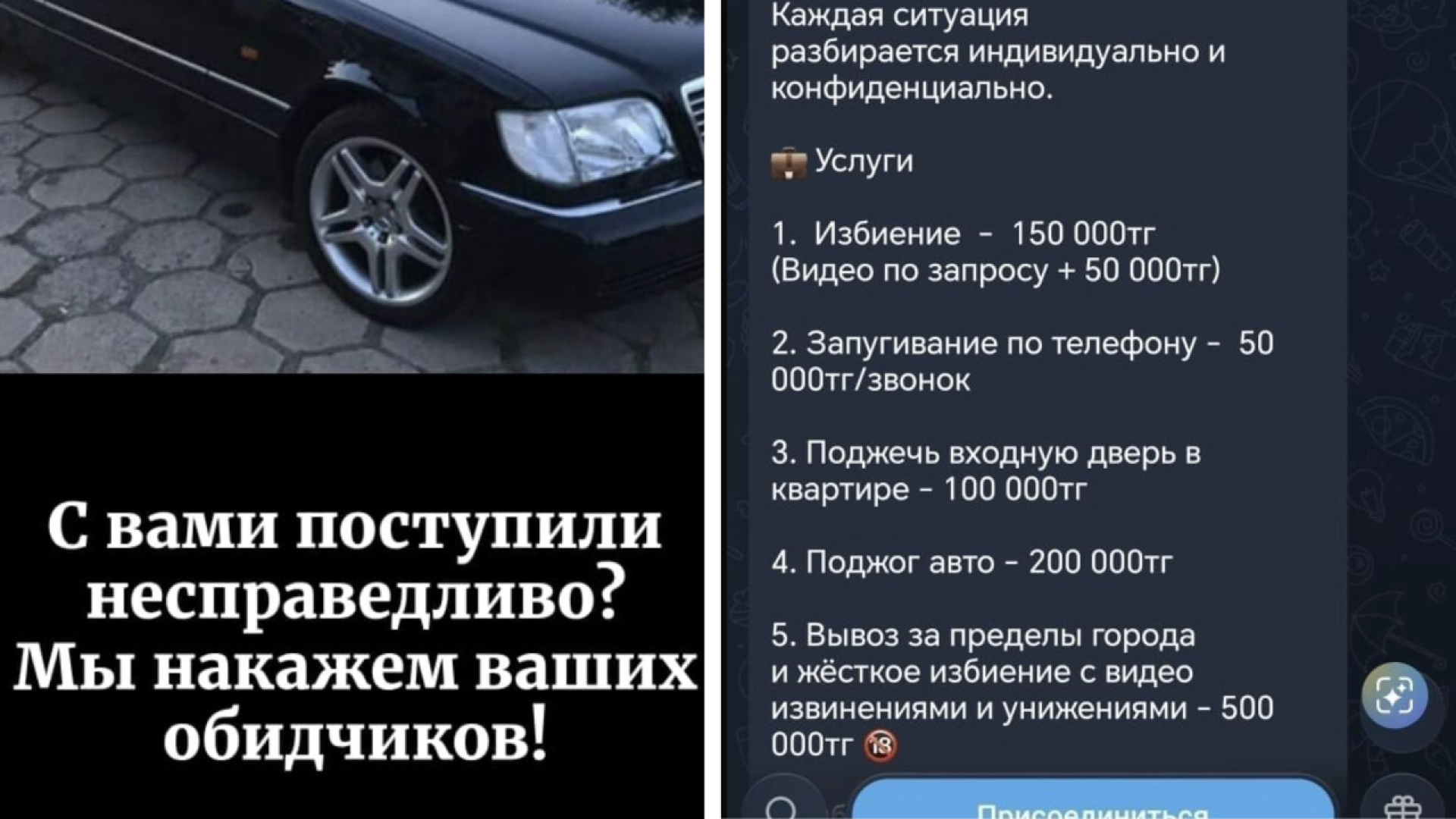 В казахстанском сегменте Telegram появилось объявление с предложением за деньги наказать ваших обидчиков. В списке "услуг" — от запугивания по телефону до поджога имущества и избиения, передаёт корреспондент Tengrinews.kz.