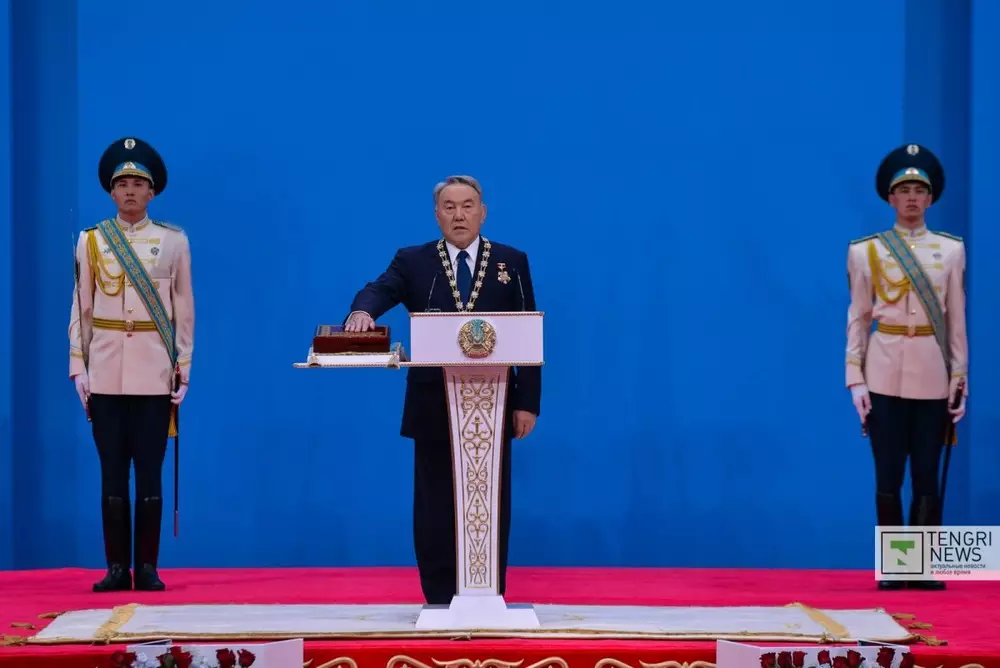 После чего, возложив правую руку на Конституцию, Глава государства зачитал клятву народу Казахстана и поцеловал знамя. Прозвучал Гимн республики.