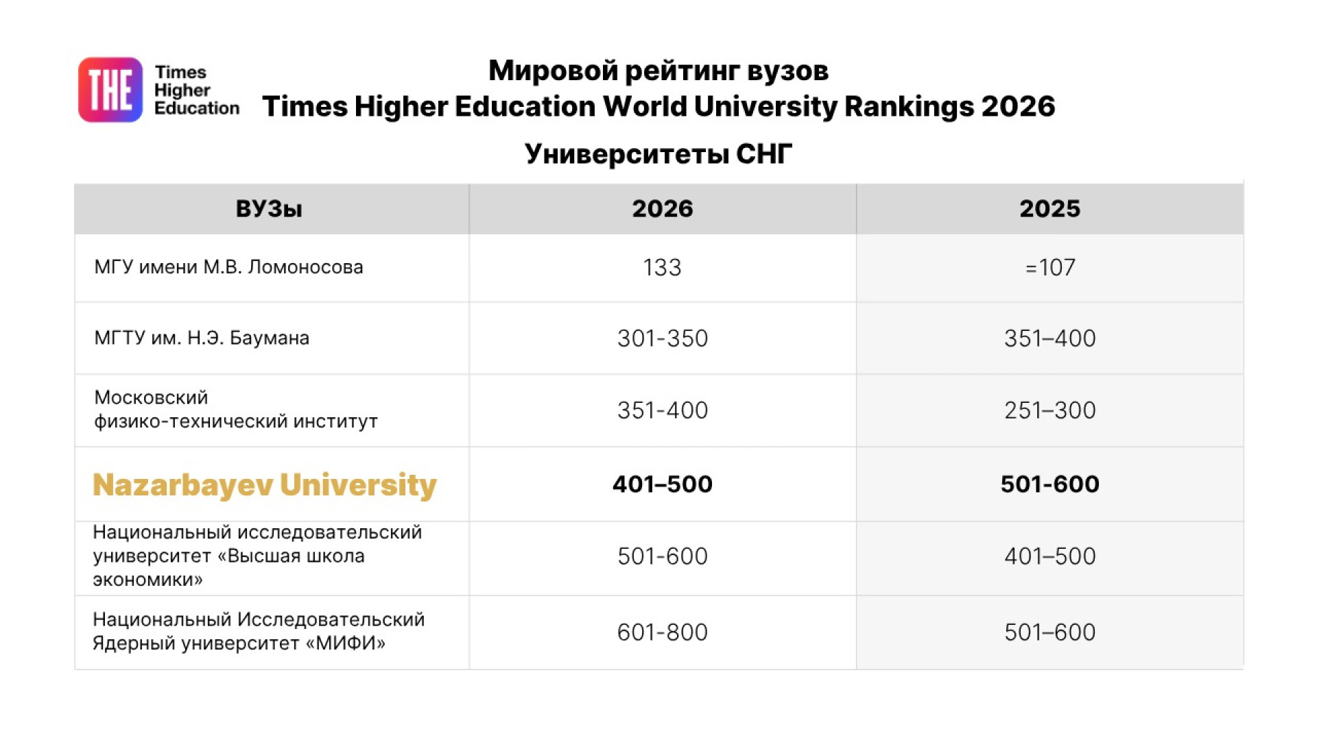 На постсоветском пространстве NU поднялся на четвертое место, обогнав в рейтинге Высшую школу экономики, известную как ведущая площадка для экономических и политических исследований в Восточной Европе, и Национальный исследовательский ядерный университет "МИФИ". Впереди только Московский государственный университет, Московский физико-технический институт и Московский государственный технический университет имени Н.Э. Баумана.