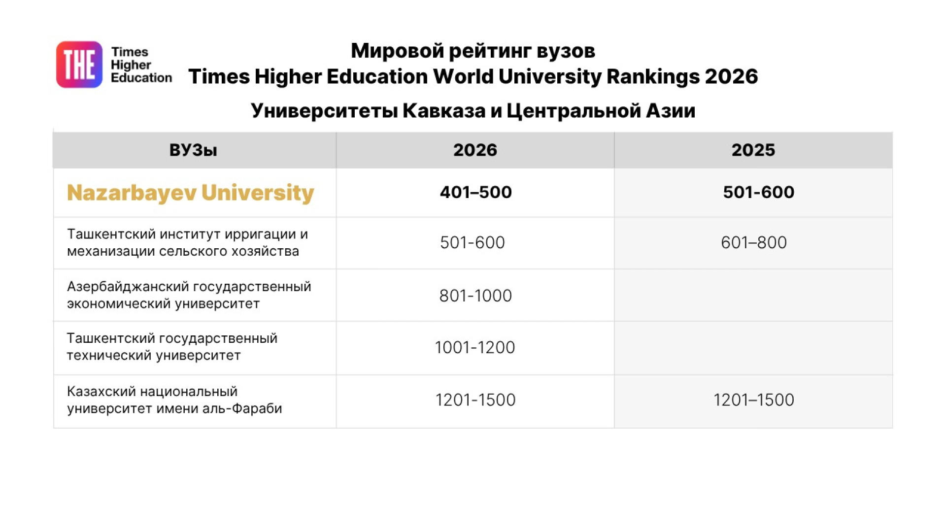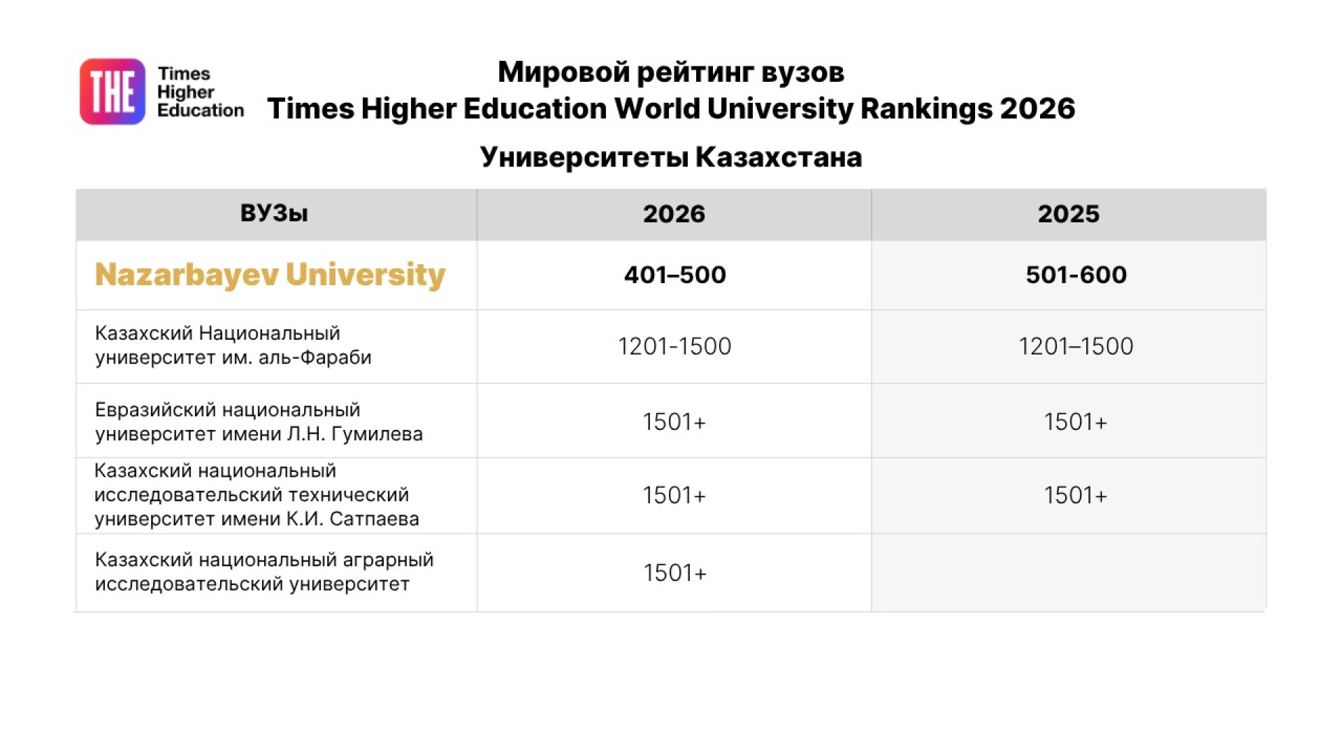 Nazarbayev University (NU) укрепил свои позиции на глобальной арене, поднявшись в самом престижном мировом рейтинге Times Higher Education WUR 2026. Как сообщила пресс-служба университета, новый рейтинг вышел сегодня, 9 октября. Молодой университет, которому более пятнадцати лет, поднялся на 100 позиций за год, укрепляя академическую репутацию страны на мировой арене.