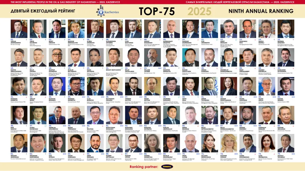 Cоюз нефтесервисных компаний Казахстана KazService представил девятый ежегодный рейтинг "Топ-75 самых влиятельных людей нефтегазовой отрасли Казахстана" в рамках Дня нефтяников, который празднуется в первое воскресенье сентября.
