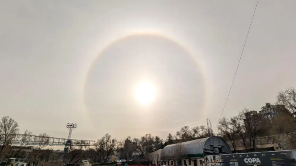 Алматинцы утром 1 апреля могли заметить солнечное гало - атмосферное явление, при котором вокруг солнца появляется кольцевидное свечение.