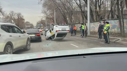 В Алматы во время дорожно-транспортного происшествия легковое авто опрокинуло на крышу, передает корреспондент Tengrinews.kz.
