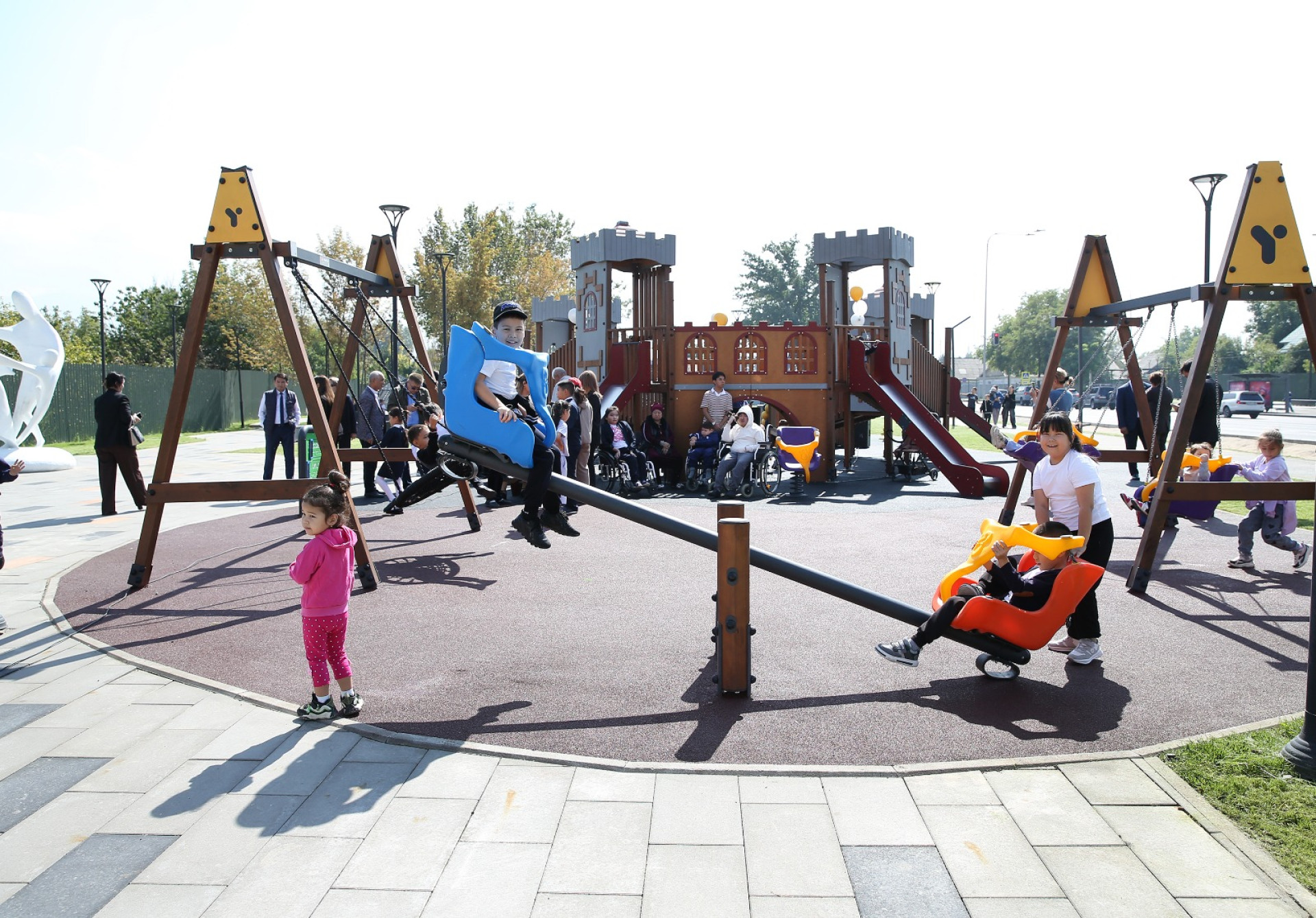 "После строительства большой транспортной развязки здесь освободились несколько участков. Мы решили использовать одно из этих пространств для создания инклюзивной площадки. Она дополнена прогулочными зонами, малыми архитектурными формами и скульптурой "Бақытты отбасы", символизирующей ценность семьи и гармонию поколений", — отметил он.
