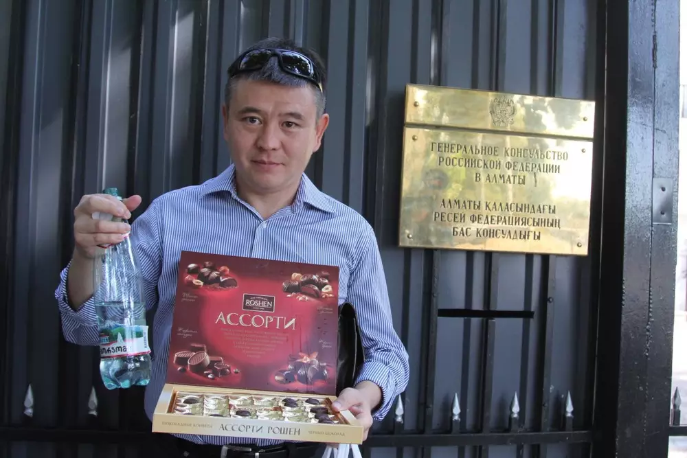 В Алматы общественные деятели пришли к консульству России с конфетами Roshen и минеральной водой "Боржоми", передает корреспондент Tengrinews.kz.