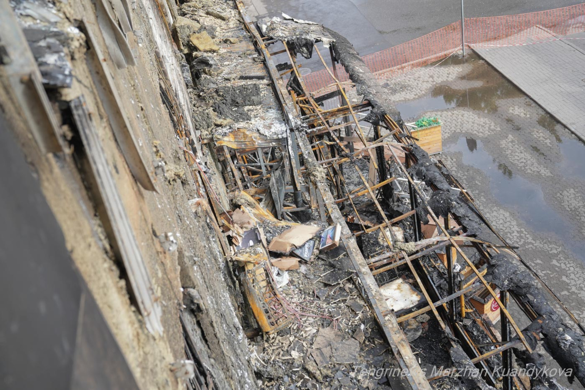 На верхних этажах заметны следы сильного возгорания — обгоревшие перекрытия и стены.