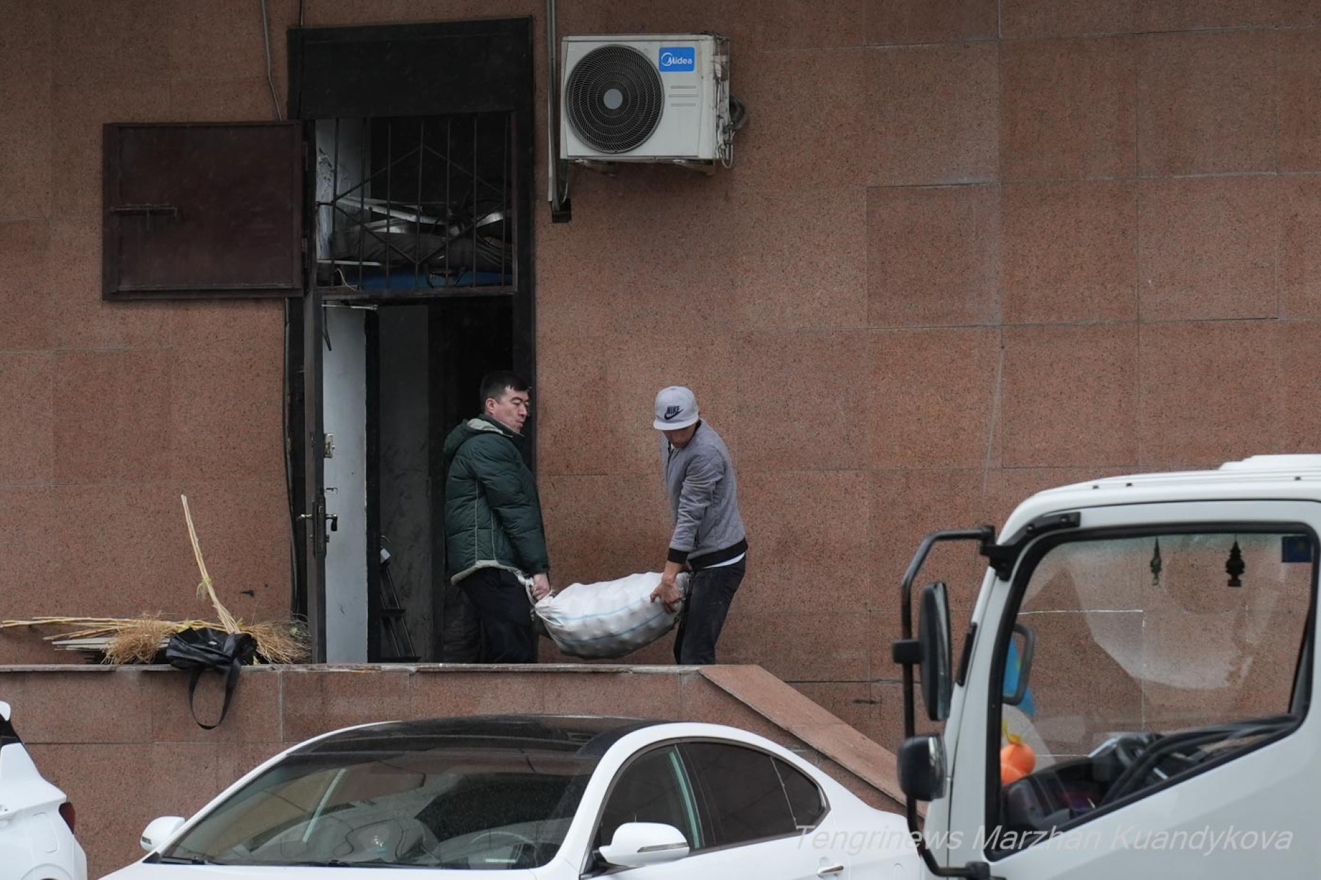 Со стороны бокового входа в кафе сотрудники выносят из помещения уцелевшие продукты — мешки с мукой, коробки с яйцами и картошку.