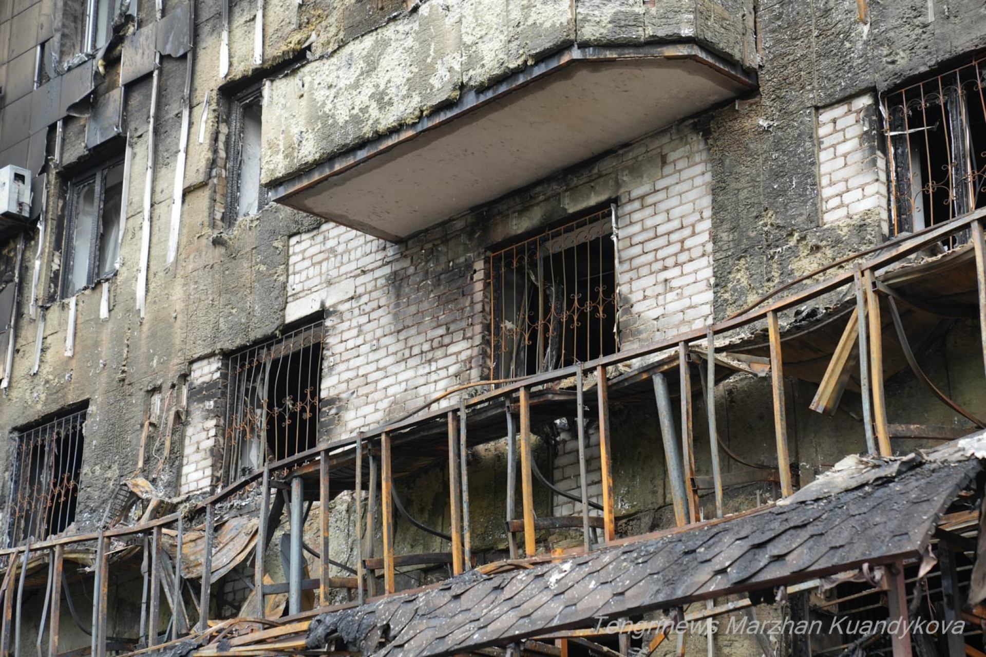Балконы верхних этажей частично обрушились, металлические конструкции искорёжены. Наружная облицовка здания местами откололась.