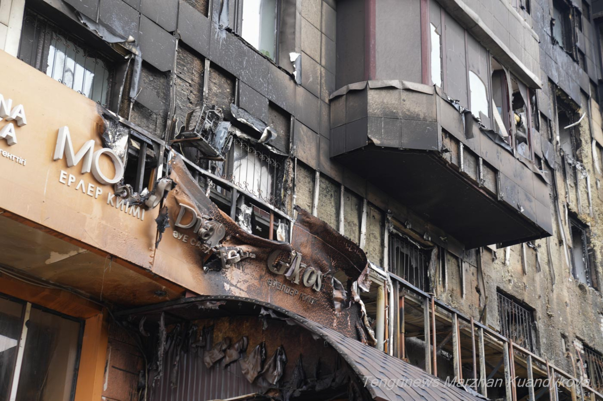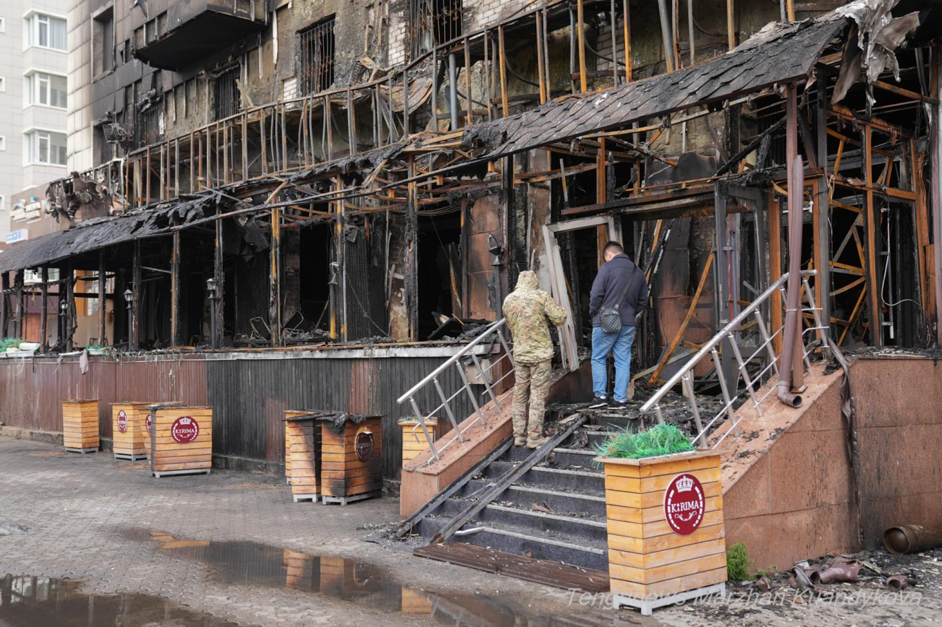 У входа на первом этаже заметны обгоревшие цветочные ящики с логотипом кафе и остатки его внутренней отделки.