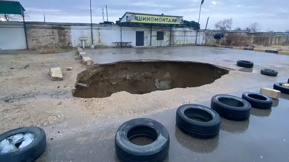 Провалившееся асфальтное покрытие сняли на видео сегодня, 26 марта, у сервиса по шиномонтажу около гаражно-строительного кооператива "Строитель" в 21-м микрорайоне Актау, передает Tengrinews.kz со ссылкой на Lada.kz.