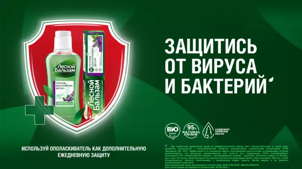 Ополаскиватели "Лесной Бальзам" помогают решить целый комплекс проблем с зубами и деснами, а главное, являются эффективным и очень простым способом профилактики кариеса, появления неприятного запаха изо рта или заболеваний десен. Однако недавние исследования в независимой международной лаборатории Microbac Laboratories показывают эффективность формулы ополаскивателя "Лесной Бальзам", содержащей антимикробный ингредиент СРС (Cetyl Pyridinium Chloride – цетилпиридиния хлорид) в концентрации 0,07 процента, в подавлении активности вирусов.