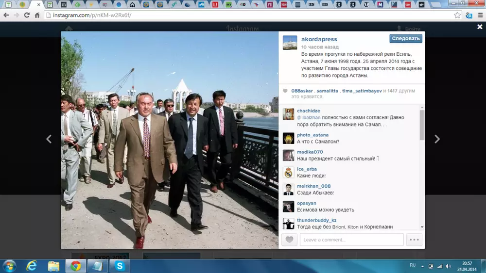 Официальный сайт Президента Казахстана Нурсултана Назарбаева в четверг опубликовал редкую фотографию Главы государства. "Во время прогулки по набережной реки Есиль, Астана, 7 июня 1998 года", - подписан снимок.