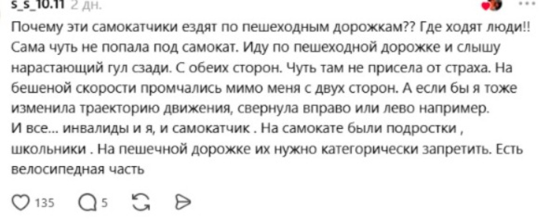 Сами горожане отмечают, что действующие ограничения на практике нередко игнорируются уже не первый год. В результате электросамокаты продолжают передвигаться по тротуарам на высокой скорости, создавая риски для пешеходов.