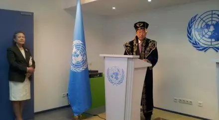 После того как генеральный секретарь ООН перерезал ленточку и поприветствовал коллег - сотрудников представительства ООН в Казахстане, ему была присвоена степень Почетного доктора Казахского национального университета имени Аль-Фараби. Церемонию награждения провел ректор вуза Галимкаир Мутанов. Он же одел Пан Ги Муна в казахский национальный костюм.