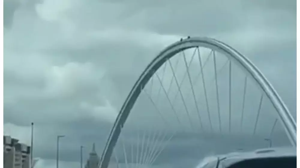 В социальных сетях появилось видео очевидцев, на котором неизвестный забрался на арку моста в столице.