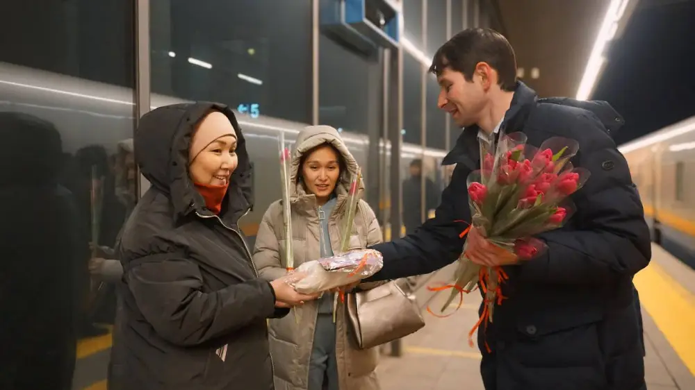 На перронах столичных вокзалов и в поездах всех пассажирок встречали цветами, отмечает корреспондент Tengrinews.kz со ссылкой на КТЖ.