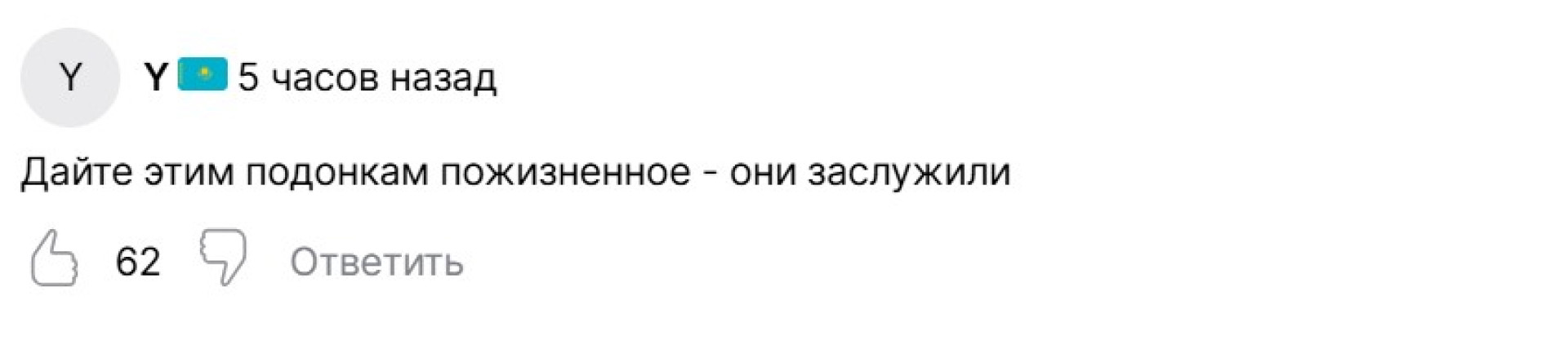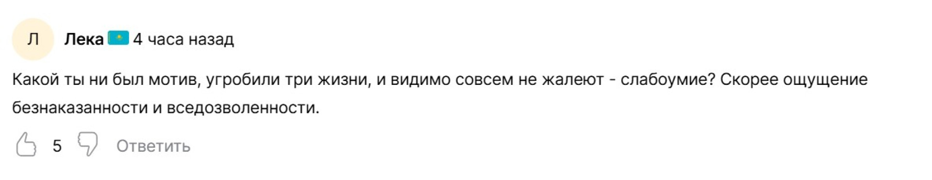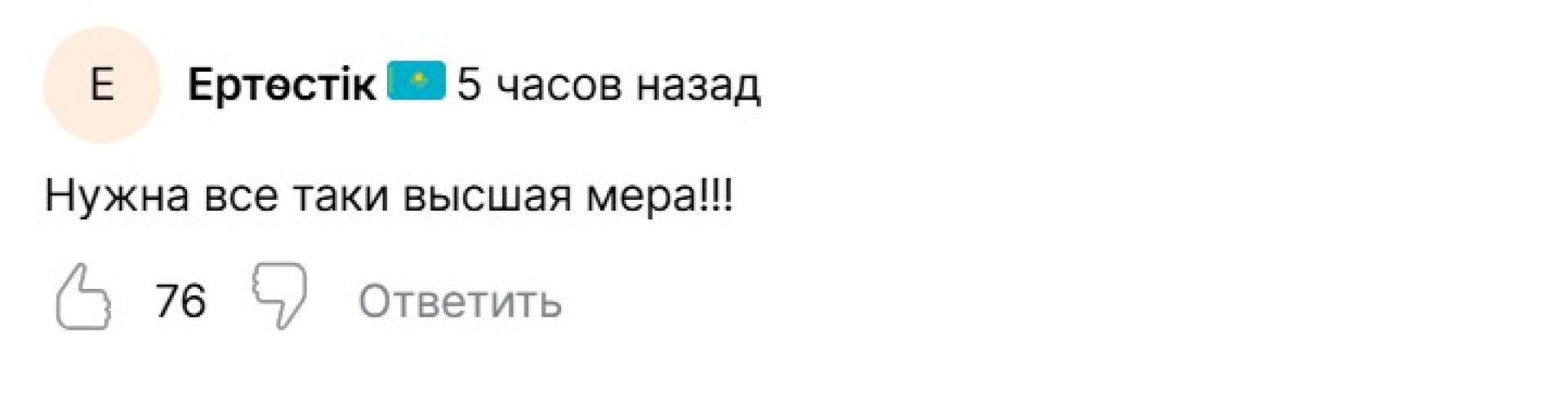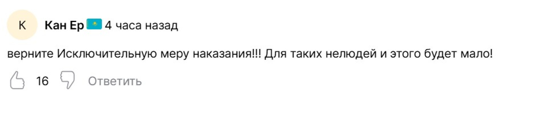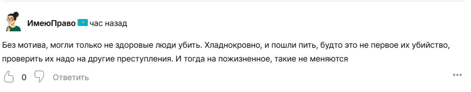 Многие читатели Tengrinews.kz заявили о том, что за такое преступление необходима исключительная мера наказания, то есть смертная казнь, которую в Казахстане давно отменили. По мнению других читателей, виновные (если или когда их вина будет доказана - прим.) заслуживают пожизненного заключения. Многие задавались вопросом о мотиве убийства и требовали проверить обвиняемых на причастность к другим преступлениям.